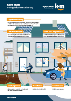 Die Wohngebäudeversicherung allsafe select ersetzt Kosten für Schäden am Gebäude, die beispielsweise durch Feuer, Blitz, Sturm und Leitungswasser verursacht werden. Darüber hinaus können Sie sich gegen die finanziellen Folgen aufgrund von Schäden durch Vandalismus, Glasbruch oder Elementarereignisse absichern.